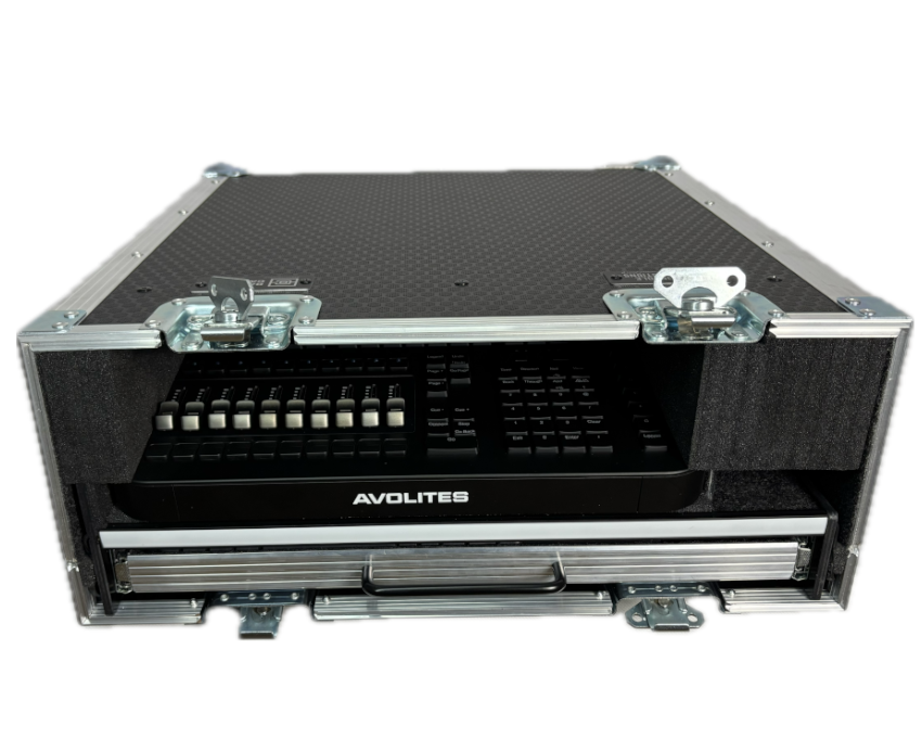 Wysokiej jakości skrzynia transportowa „case” z szufladą i odpinanym wózkiem. Ekrany składają się na płasko, co pozwala na kompaktowe wymiary skrzyni: 54 cm x 64 cm x 24 cm. System jest okablowany i skonfigurowany, gotowy do użycia. Wymaga jedynie podłączenia AVO T3.